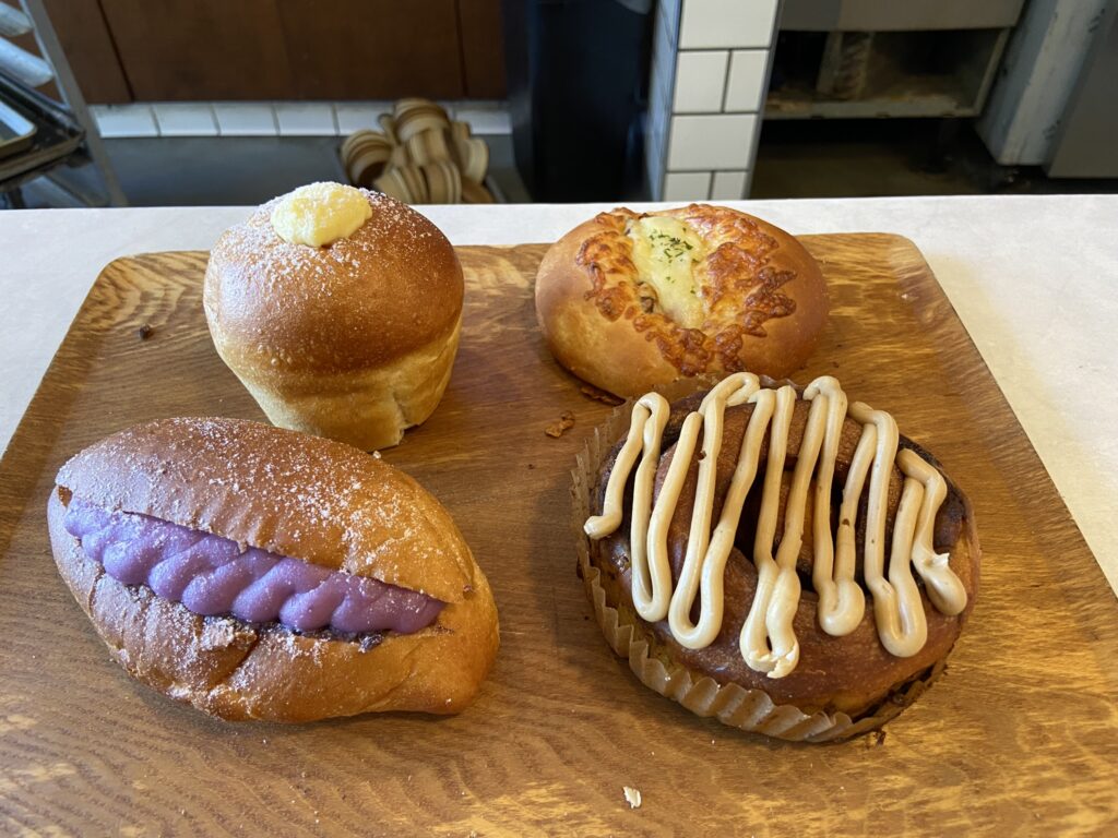 (左上) Vanilla Bean Custard$5 カスタードにはしっかりとバニラビーンズが散りばめられ、トロッとした食感と甘さのバランスが秀逸。軽い口当たりながらもコクがあり、ベーカリーの丁寧な仕事ぶりが感じられます。(左下)Ube Anko $5.50 紫芋(ウベ)とあんこの組み合わせは、見た目も鮮やかで、甘さ控えめながら素材のコクが生きています。ひと口目にふわっと広がる芋の香りと、濃厚クリームx粒あんの優しい甘みが至福。