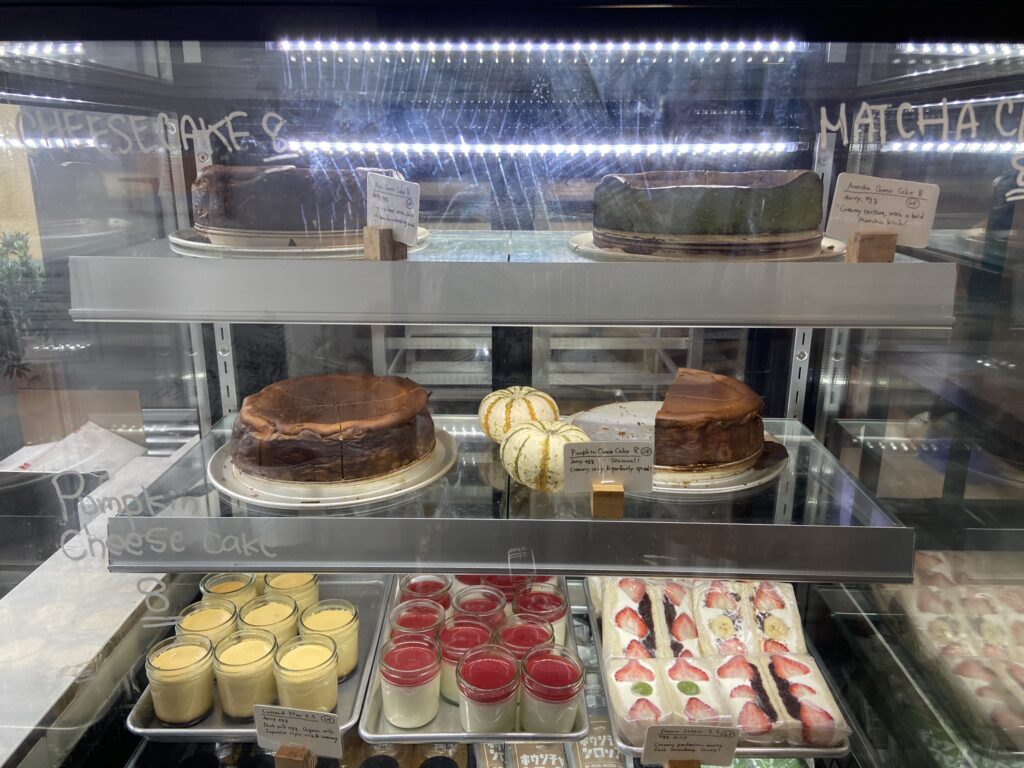 午後のショーケースに並ぶスイーツ類。チーズケーキ(プレーン、抹茶、パンナコッタ)各$8/pc、カスタードプリン$5.5、パンナコッタ$5.5、フルーツサンド各種$12